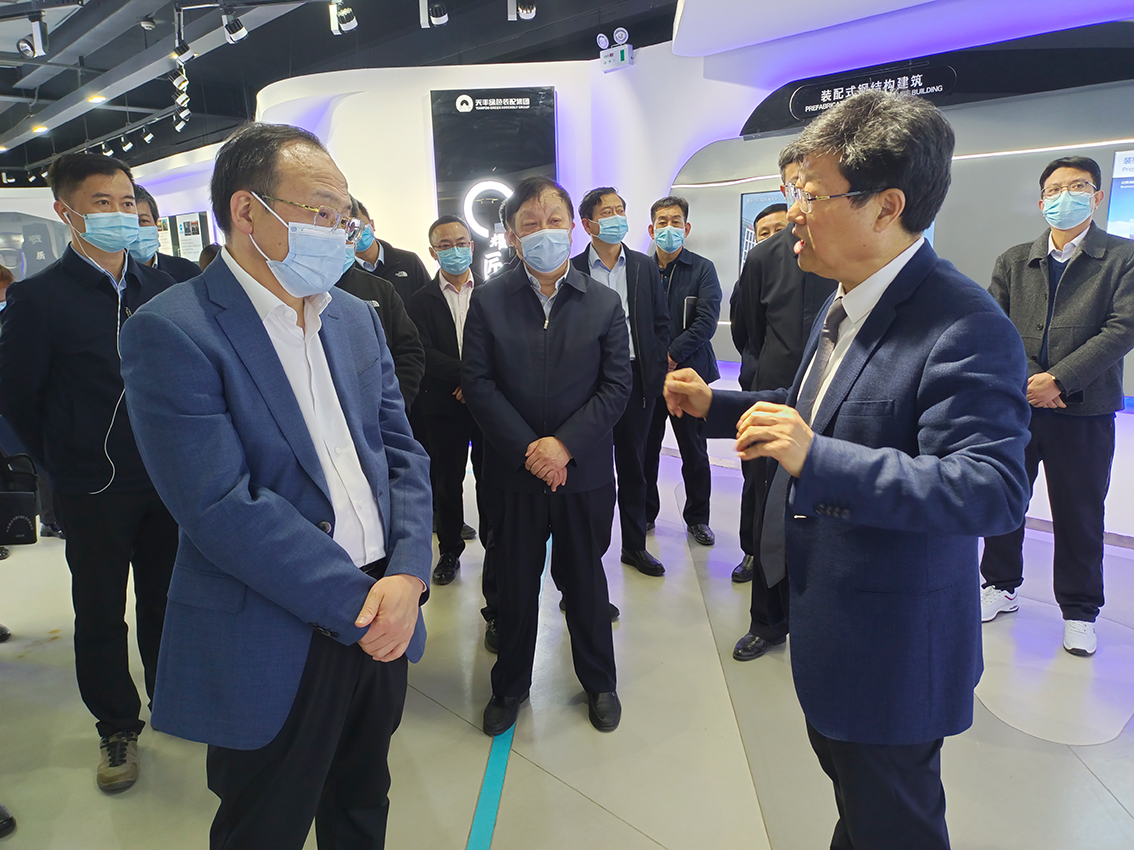 在集术装配建筑体系样板前,魏市长了解到天丰自主创新发明的集术装配建筑体系,其包含集术钢结构结构系统、围护系统、设备管线和装配式装修系统,集术体系的优势在于其钢结构结构系统够适配各种围护体系,其技术含量被国家认定为“达到国际先进水平”。集术装配建筑体系建造的信阳市上天梯碳中和研发展示中心项目,荣获德国被动房PHI Plus优级认证。魏市长指出:天丰要延伸产业链条,在做好建筑结构体系同时,带动围护体系、设备管线体系、装配式装修体系等协同发展,形成绿色建材产业链。魏市长对陪同调研的高新区领导说,装配式绿色建材行业是一个巨大的市场,你们要关注天丰及这个行业的发展,帮助天丰构建绿色建材产业链。